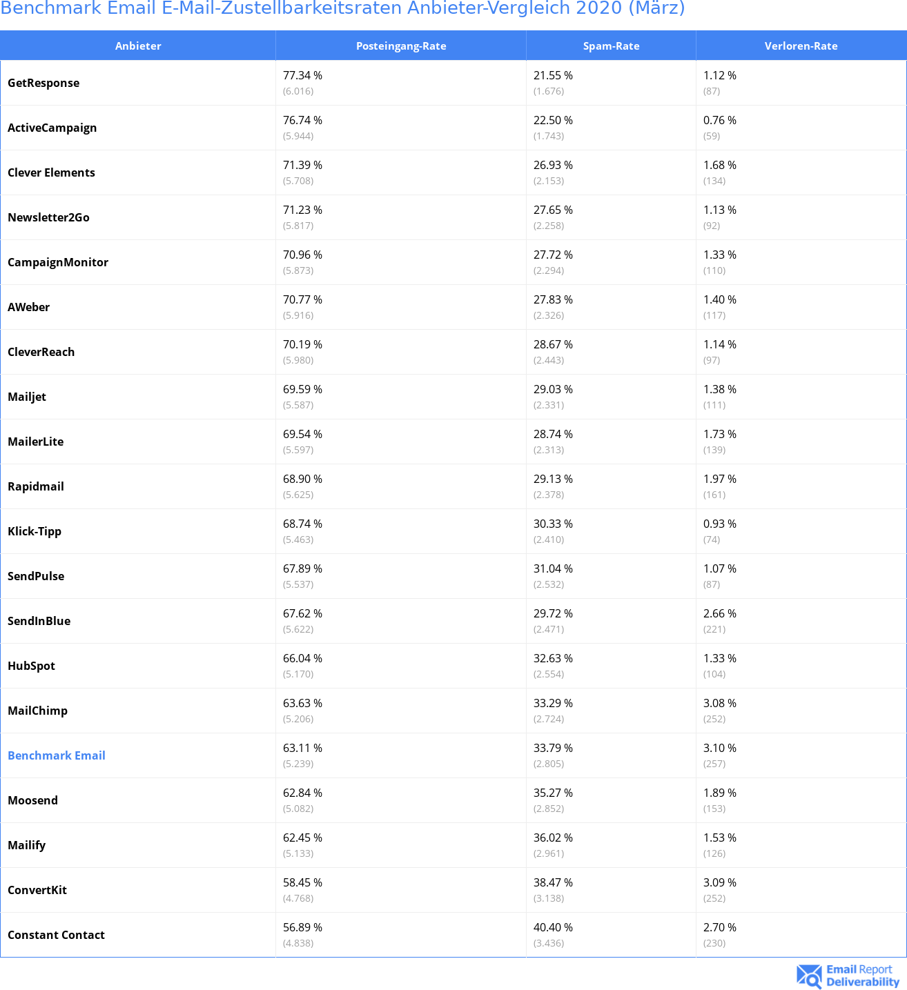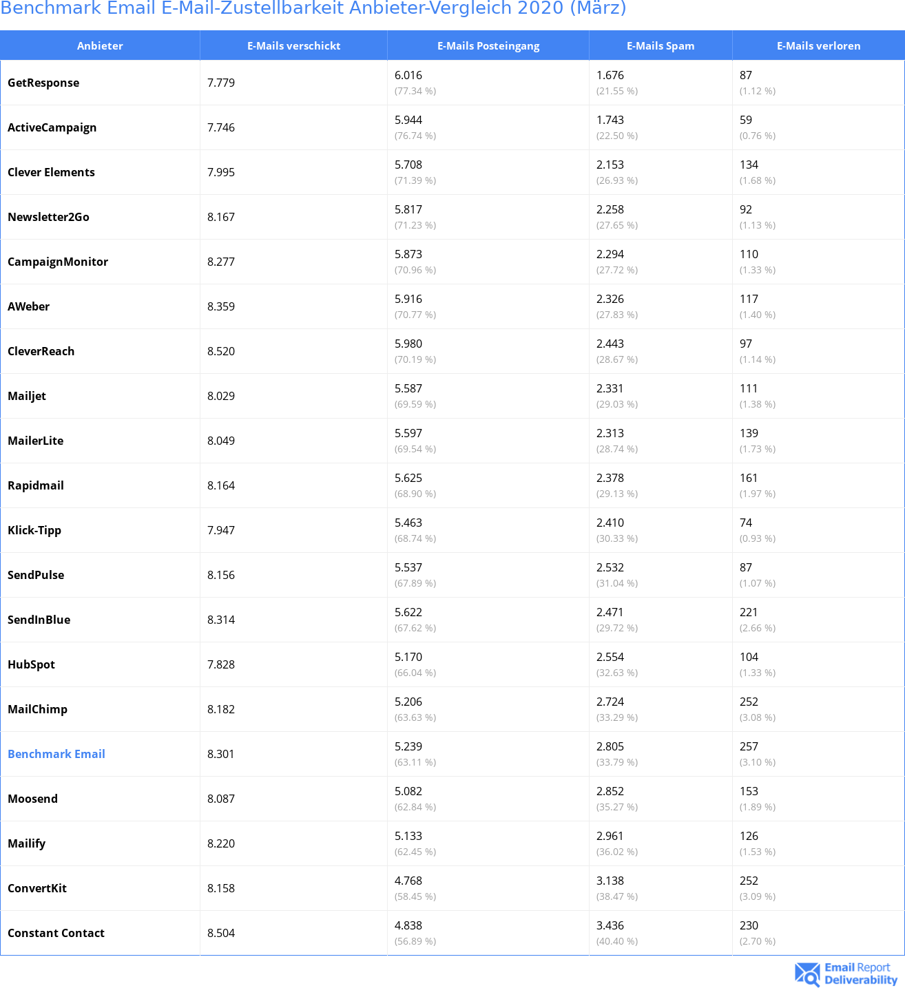 In diesem E-Mail-Zustellungsbericht für Benchmark Email (März 2020) gibt es unter anderem ausführliche Details zu der Zustellbarkeit von E-Mails im Vergleich mit anderen Anbietern und wie gut die Zustellraten in den zahlreichen Branchen und bei unterschiedlichen E-Mail-Dienstanbietern sind.