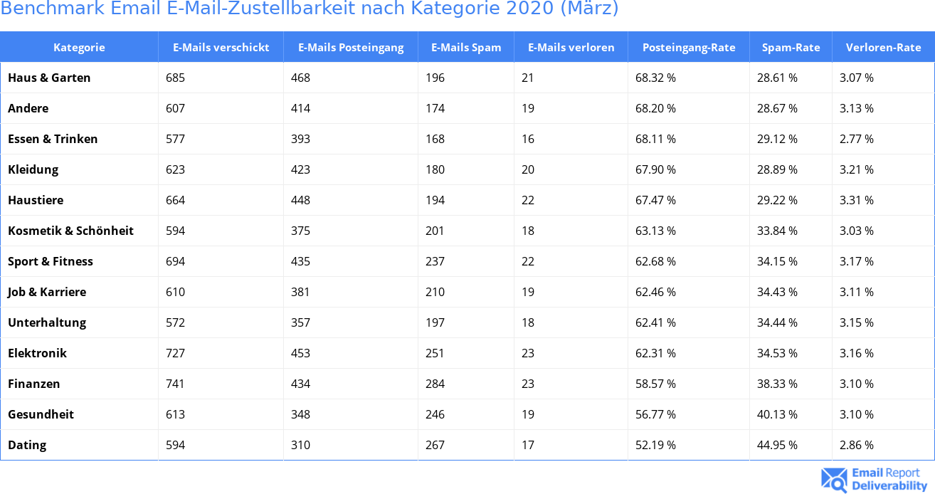 Die Zustellung der E-Mails mit Benchmark Email in die Kategorien Haus & Garten, Andere, Essen & Trinken, Kleidung und Haustiere resultierte in besten Zustellraten. Bei den Kategorien Dating, Gesundheit, Finanzen, Elektronik und Unterhaltung konnten hingegen die schlechtesten Zustellraten erreicht werden.