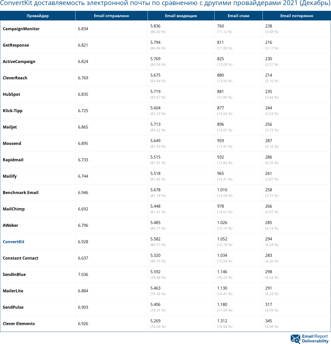 Доставляемость электронной почты для ConvertKit и других провайдеров в сравнении